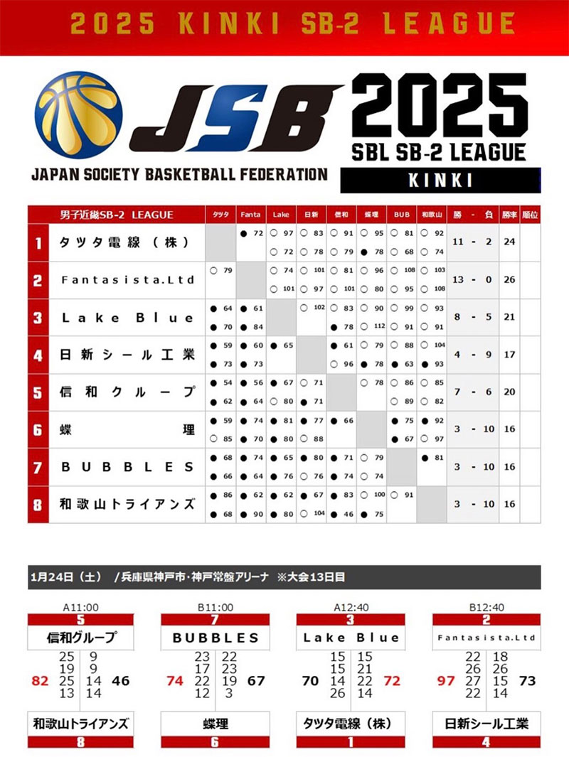 2024-25 SBL男子近畿 SB2リーグ(前地域リーグ)の2巡目試合結果です。
